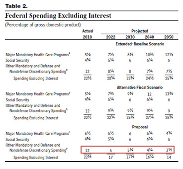 "Notice the marked area at the bottom: Ryan is assuming that everything aside from health and SS can be squeezed from 12 percent of GDP now to 3 1/2 percent of GDP. That’s bigger than the assumed cut in health care spending relative to baseline; it accounts for all of the projected deficit reduction, since the alleged health savings are all used to finance tax cuts. And how is this supposed to be accomplished? Not explained."